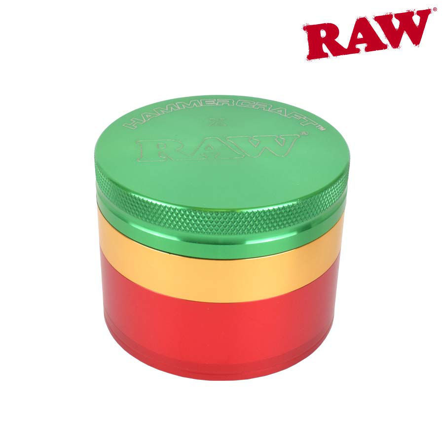 “RAW x HAMMERCRAFT Aluminum CNC Grinder SOLD INDIVIDUALLY Available in RASTA / BLACK / RED Large: 63mm / 2.5 Medium: 56mm / 2.2 Small: 50mm / 2”